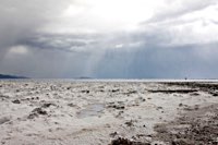Aber genau in dem Moment kommt schlagartig Wind auf und eine Regensäule bewegt sich schnurstracks auf die Strecke zu .... und....trifft. Die Rennleitung sagt ab. Keiner startet mehr. Es regnet, was es regnen kann und aus dem Salzsee wird schlicht und ergreifend ein See. Alle Bikes zurück in die Zelte und Trucks, also 8 km zurück im strömenden Regen durch ca 15cm hohes Wasser. Tom's Einspritzelektronik kriegt Salzwasser ab und blendet sich kurzentschlossen aus. Also wird der T101 zurück geschoben. Tom kommt dank Vergaser bis zum Truck.