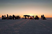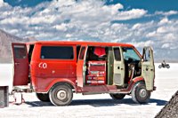 Aber erst die Arbeit: Bikes checken und für morgen fertig machen. Springen sofort an und laufen wie Uhrwerke - irgendwie ein guter Tag heute – wenn man vorgesorgt hat: Hut ist schon mal Pflicht, aber das weisse Salz reflektiert zusätzlich das Licht von unten nach oben, das heisst man bekommt auch Sonnenbrand an Stellen, wo man noch nie welchen hatte: in (!) der Nase, unterm Kinn, unter den Ohren, bei kurzer Hose bis in den Schritt und bei ärmellosen T-shirts in den Achselhöhlen. Kein Scherz, sondern Schmerz.