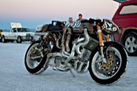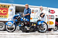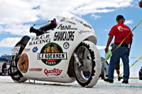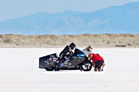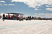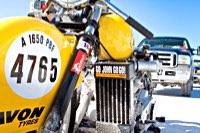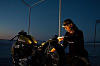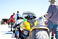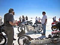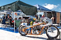 Fehlt nur der amtliche Aufkleber der AMA auf dem Tank. Ohne den darf hier nichts auf die Bahn. Während wir auf den Bonneville TÜV warten passiert es. Ein Geräusch, das ich so noch nie gehört habe. Eine Maschine zieht mit blossem Auge nur als schwarzer Punkt erkennbar durch die weisse Wüsste. Das ist der International Track, der ist ganz weit draussen und sehr lang. Jedenfalls werden auf dem die Weltrekorde gefahren. Das Geräusch lässt mich zusammenzucken und ich habe auf der Stelle Gänsehaut. Das schwarze Pünktchen da draussen auf dem Salz taucht aus dem Nichts auf und verschwindet in Sekunden wieder im Flimmern der Hitze. Sehen kann man schon nichts mehr, aber das Brüllen geht nach wie vor durch Mark und Bein bis dann irgendwann die Drosselklappen zufallen und das Geschoss an der Lichtschranke vorbei ist. Alle schauen in die Richtung, in die der Punkt im Flimmern verschwunden ist, auch wenn keiner mehr was davon sieht.