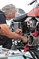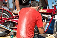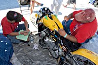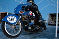 Technische Abnahme. Tom's T101 besteht und ist in der richtigen Klasse eingetragen. John's Hammer ist in der Klasse Production eingetragen, also Stock Bike. Dass ein S&S Vergaser montiert ist und eine Springergabel aus einer Softtail sorgt dann aber dafür, dass Tom seinen Hammer umschreiben muss in 'modified'. In dieser Klasse kämpft er zwar gegen echte Kaliber wie z.B. Tom's Bike mit Blower, Einspritzung und dergleichen, aber er sieht's locker: I don't care - I'm here to have fun !