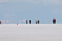 Es ist klar, hier wird heute (ausser vielleicht mit Booten) keiner mehr ein Rennen fahren. Die Rennleitung tröstet uns. Morgen ist alles trocken und das Salz liegt schöner als je zuvor.