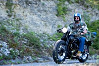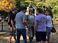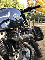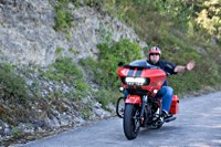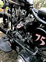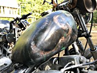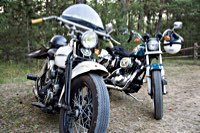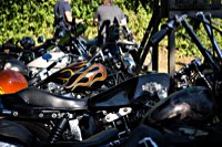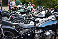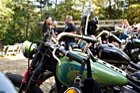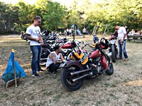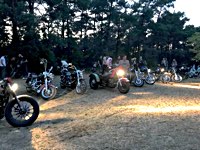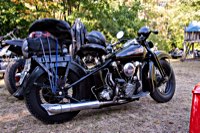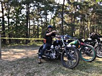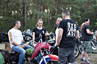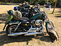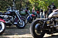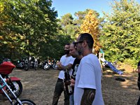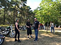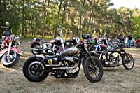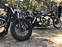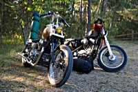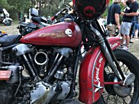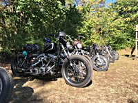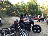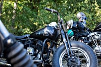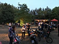 rund 40 Harleys durch fränkische Weinberge, rumpeln ein paar Meter über Stock und Stein (wohl dem, der Bates Baja aufgezogen hat;-) und finden sich auf einer Lichtung wieder, die schon in vollem Partyoutfit ist. Und was haben wir alles da? 5 Knuckleheads, jede Menge Panheads, einige Shovelheads, Flatheads, Evos und ja, auch ein Milwaukee Eight.