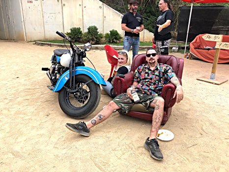Und so lief‘s: An der richtigen Stelle von der Straße runterkurven - das „Welcome Old & Proud“-Banner hilft – rauf auf den Waldweg, an bebaumten Bergstraßen entlang bis zum Schild „La Cantera – Biker Bar“. Noch ein paar Meter Gerumpel und da ist es schon, das Empfangskommitee, da auf dem Sofa. Die Aufgabe ist klar: nach rechts auf den Parkplatz bitte die Autos und Post-84-Mopeds, nach links zum Steinbruch darf alles, was vor Evo war.