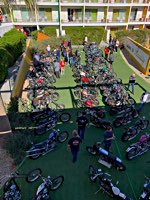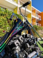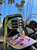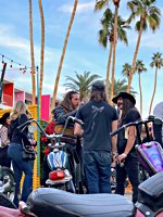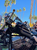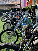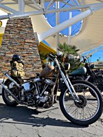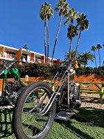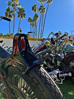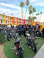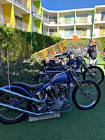 Der Himmel in einem unwirklichen Dauerblau wie auf 60er Jahre Postkarten, das Ganze in einem Hotelkomplex, der aussieht wie von den Coen Brüdern ausgedacht. Auf den Aussenparkplätzen hochgejazzte Vierrad-Legenden und im Innenhof alles zugeparkt mit Harley Choppern, die bis hin zu den Abwetzspuren eines Stickers mit so viel Begeisterung für ausgefallene Details zusammengebaut und gestylt sind, dass es schon fast wehtut – das kann doch alles nicht wahr sein!?