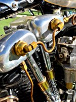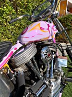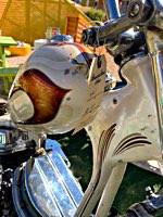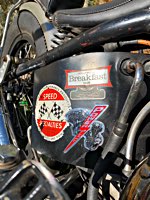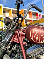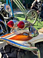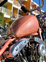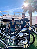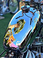 Road, joooaaaa, hat was mit Straße zu tun, aber den Kisten, die hier stehen, wird man kaum auf entlegenen Landstraßen in der Baja begegnen. Bei den Autos (welch profanes Wort für diese „Werke“) dürfte es ähnlich aussehen. Und Paradies? Aber ja, für den Harley-Fan ist hier auf jeden Fall das Vintage-Chopper-gnadenlos-krasses-Zeug-verbaut-Paradies. Das zeigt schon die Wolke von außergewöhnlichen Schraubern, die hier sind: Cycle Zombies, Powerplant, Expansive Trash, Vee Choppers, usw. Und auch sonst flattern hier viele Paradiesvögel rum, mit denen man aber bestens plaudern und Bier trinken kann. Also: Paradise Road Show: Note 1. Und zwar die 1 vom leicht angegimmelten und matt gewordenen original AMF Zündungs-Deckel einer 1971 Eisenkopf-Sportster. Im Starrrahmen. Mit Langgabel, Baby!