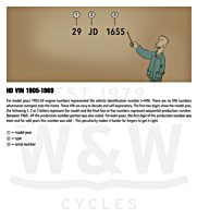 Die VIN (Vehicle Identification number) ist in den Motor eingeschlagen - Fahrgestellnummern am Rahmen gab es noch keine. Die Entschlüsselung ist einfach: die ersten beiden Ziffern zeigen das Baujahr, dann folgen 1, 2 oder 3 Buchstaben für das Modell, danach die laufende Produktionsnummer. Bei der gab es in den Baujahren 1960-69 eine Besonderheit: war das Baujahr eine ungerade Zahl, so war auch die erste Ziffer bei vierstelligen bzw. die ersten beiden Ziffern bei fünfstelligen Seriennummern ungerade. Entsprechendes galt für gerade Baujahre — an dieser Besonderheit ist schon so mancher Betrugsversuch aufgeflogen.