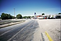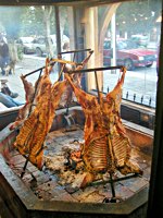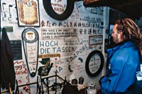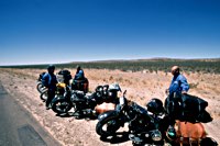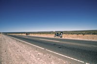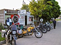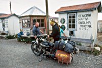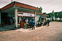 Jetzt ist Morgen und es schifft wie aus Kübeln. Also erstmal entspannt fertigpacken. Weiterer heiterer Zeitvertreib: „mal kurz“ ein paar Fotos per Internet nach Würzburg schicken. Dann lässt der Regen nach, die Patagonischen Reiter nehmen die ersten Meilen argentinischer Strasse unter die Reifen: 400 km auf der Ruta 3 nach Azul. Pflichtbesuch im Globetrotter-Treff „La posta del viajero en moto“. Eine bescheidene Hütte mit Werkstatt, übersät von Sprüchen, Geschenken, Bildern, Aufklebern und Grüßen von Moteros aus aller Welt. Der Tag endet traditionell: Asado, Bierchen, Bett.
