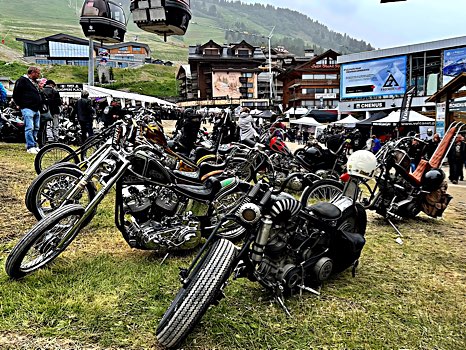Wo sich schon bald darauf die wadenkraftbetriebenen Zweiräder in die luftige Alpenhöhe von Courchevel 1850 plagten, verrichten vorher die Hubräume zahlreicher Harleys die notwendige Arbeit, um ihren Pilotinnen und Piloten entspannte Blicke aus der Kurve in die Bergwelt zu schenken – ein wenig getrübt durch nieseliges Wetter, aber das kann einen echten Gipfelstürmer nicht aufhalten, denn es war "Punta Bagna!" vermerkt auf dem diesjährigen Motorradkalender. Und wieder einmal war hoch da oben alles, wie man es liebt: ein ganzes Städtchen pulsierte im Rhythmus der Bands, die auf der Bühne mitten im Ort spielten, und die Stimmung bollerte wie ein gut abgestimmter Milwaukee-Motor. Überall fand man Künstler, die Helme, Tanks, Accessoires und ganze Bikes zu wertvollen Unikaten machen.