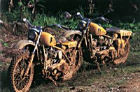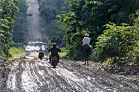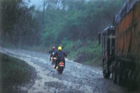 Mit jedem Meter wühlen sich die Pan-Americanas tiefer in den schlonzigen Morast. Hier entwickelt sich der anfangs so hilfreich praktische Geländewagen zum Hauptproblem bei der Überwindung der immer wiederkehrenden 50 bis 150 m langen Schlammpassagen: Die Furchen, die "El Tractor", ein umgebauter Big-Foot-Toyota, der die Strecke als Polizei-Taxi-Transport-ADAC abfährt, hinterläßt, sind gute 40 cm breit und tief. Breit genug, daß zwar die Mopeds - wenn auch mit Anlauf - durchkommen, aber zu tief für den Geländewagen. Immer wieder setzt er auf. Nur unter Beteiligung zufällig vorbeikommender Indianer und mittels abgehackter Bäume und tonnenweise Steine - wohlgemerkt bei 40° im Schatten und 200% Luftfeuchtigkeit - , kriegt man ihn wieder los. Daß sich dieses Prozedere ständig wiederholte, wirkte sich sehr nachteilig auf die Reisegeschwindigkeit aus: in 6 Stunden grade mal 5 Kilometer weit.