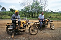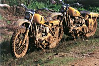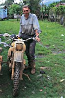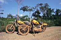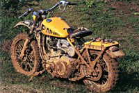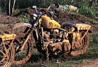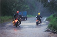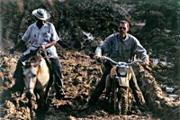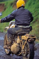 Nachts hatte es der Regen den Pan-tastischen Vier gleichgetan und eine kleine Pause eingelegt. Mit dem Erfolg, daß sich der Schlamm etwas gesetzt hatte. Wolfgangs Drängen, sofort aufzubrechen, bevor es wieder regnet und womöglich der Traktor alles wieder aufwühlt, führt beinahe zu einer Meuterei. Erst die Aussicht, daß in Santa Fe ein halbvolles Duschfaß wartet, beruhigt die Gemüter. Für den Weg zurück durch den Schlamm geht alles wieder von vorne los. Meterweise werden Geländewagen und Motorräder wieder zurückgeschafft. Dabei bretzelt Wolfgang durch eine Schlammpassage und übersieht einen der großen Steine, die man vorher zur Wegbarmachung in die Fahrrinne gepflanzt hatte . Das Skidplade hebt das Motorrad rechts an und wirft das Moped stuntreif nach links. Die Gute Nachricht: der Motor wurde durch den Deadman-Switch sofort gekillt: Die schlechte: Eingeklemmt mit dem linkem Bein zwischen Motorrad und Schlammfurchen muß Wolfgang mit der rechten Hand und dem rechtem Fuß den Stein freischaufeln, rauswuchten und dann die Kiste in der Schlammbrühe ankicken. Panhead sei Dank lief das Ding auf den ersten Tritt.