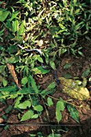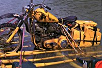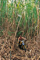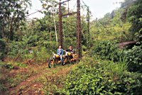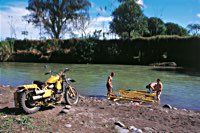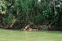 Für die Fahrt zurück nach San José hat Juan einen Geheimtip: Ein Weg, so geheim, daß es gar keiner ist. Sondern vielmehr ein seit Jahrzehnten unbenutzter Trampelpfad durch meterhohes Schilf. Da helfen nur noch Kompaß und Macheten. Und wie schon gehabt, endet auch dieser Weg im Río Toro Amarillo. Die Straße, die sie eigentlich suchten, erspähten die Pan-tastischen Vier dann am gegenüberliegenden Ufer. Gut, daß unsere Rucksäcke eigentlich so etwas wie 50 Liter Mostfässer mit Henkel und Tragegurten waren. Also die optimalen Schwimmkörper für Mopeds jeder Art.