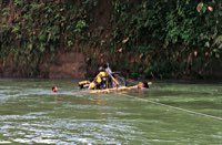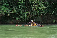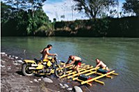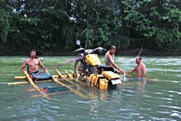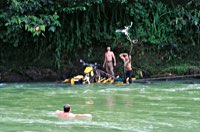 Eindrucksvoll überredet man das anwesende Bambus mittels Machete zur Kooperation in Sachen Floßbau. Unter fachkundiger Anleitung von Gerardo als Hobbyseemann und Knotenexperte werden die Mopeds verladen, verknotet und verzurrt.