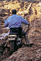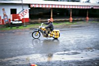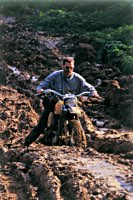 Das wird zu einem sofortigen Ausbau des Verteilers genutzt. Mit gezielten Hammerschlägen werden mehrere Kühlrippen abgeklopft, um den Verteiler zu entnehmen. Erst als er raus ist, fällt den 4 Feinmechanikern auf, daß es einer der berühmten zerlegbaren W&W-Verteiler ist, der zur Rettung der Kühlrippen extra eingebaut wurde. Aber wer braucht schon Kühlrippen. Nun - wenn man schon am Basteln ist, kann man ja auch gleich die Kontakte auswechseln und die Zündung neu einstellen. Dann geht es wieder auf die Schotterpiste. Die großen und kleinen Schotter, die sich in lockerer Formation den Pan-Americanas in den Weg legen, gehen den Pan-tastischen Vier schwer auf den Zeiger. Und noch mehr auf‘s Kreuz. Der Regen tut ein übriges zum allgemeinen Vergnügen - langsam ähnelt das ganze Unternehmen immer mehr einer Tauchfahrt.