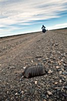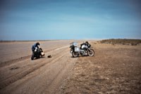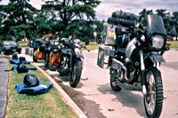 Drei Wochen nach der Abholung der Motorräder machen sich die 4 Patagonischen Reiter Joe, Paul, Tommy und Volker auf den Weg nach Buenos Aires, um dort ihre aus je 1200 cubic befeuerten V-Twins zu besteigen: Pauls 46er Knucklehead, an deren Starrahmen zwei monumentale 19“ Räder hängen - handgeschaltet und fussgekuppelt, genau wie Joes 47er Knuckle mit dem reisefreundlichem 5- Gallonen-Tank. Volkers höhergelegte Evo-Sportster, an die reichlich Stauraum für seine Fotoausrüstung gelötet wurde und schließlich Tommys Panhead, die sich schon in knietiefem panamesischen Schlamm bewährt hat.