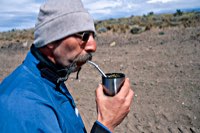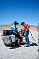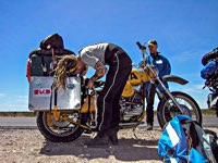 Zeit für Kettenservice. Joe und Paul friemeln. Joe löst eine falsche Schraube, versucht das Getriebe nach hinten zu ziehen - peng, Spannschraube ab. Tja , dann wird die Primärkette eben mit dem Montiereisen gespannt. Südamerika-Style. Dazwischen Akquisition neuer Harley Fans: israelische Marineoffiziere, ihre Frauen und ein englischer BMW Fahrer (GS 650). Der Brite flippt komplett aus: „You are the real heroes.“ Thank you, sir.