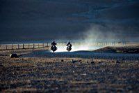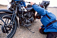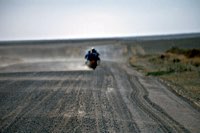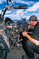 Wieder raus, auf die Piste. Bretteben. Beton. Hier geht was. 50 mph. Dann plötzlich starker Wind, aber ohne echte Chance gegen 1200 cubic. Einziges Hindernis: Joe‘s Knuckle braucht ein paar Handgriffe. Die vordere Bremsbuchsenmutter und die Mutter eines Rockers müssen nachgezogen werden. Tommy hat Angst um seine hinteren Radlager - aber es passiert nichts.