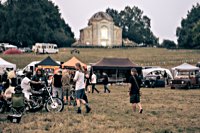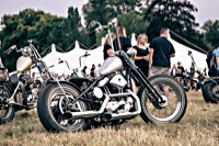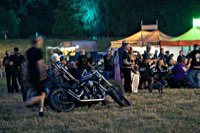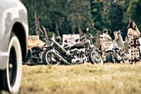 Anna and Andy, who love music and vintage Harley choppers, and it works like this: There’s this really really huge bike camping area (cars must stay in the other huge grassy field up the hill) surrounded by trees, and a church hidden among them, so you set up your tent not too close to the marquee, otherwise no sleep, but not too far away either, because: toilets :) Then you head for the food truck of your choice, get some calories on board, wash them down with a nice cold brew from the well sorted bar and spend the rest of the day listening to strange and crazy music, try to see the Meyer Dancers doing their thing, chat with the friends you haven’t seen for a long year, slowly walk around to find even more crazy choppers hidden in the bushes, get another beer, and repeat as often as you can.