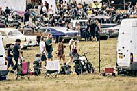 We got soaked not once, but three times :) Once across France to the Ferry, bc putting off putting on the rain gear for too long. Second time going from the South Coast to the Trip Out. And the third time on the way home. Foul weather indeed. When we started out, the radar images looked menacing. And then it got worse. Posing again that old question: why are we doing this! The good news was: the Trip Out itself was miraculously living in a bubble of warm mediterranean air all weekend while the rest of the country got seriously drenched. It was so absolutely good to roll through the gate, the clothes still clammy from the rain earlier on, and see the golden meadows of Euston Park, dry as they were under that blue East Anglia sky, already filled with hundreds of tents. Ah: to get out of those wet clothes! Changed into some dry clothes, hung the soggy kit over the bike to dry, and then went to the bar for a truly well deserved beer.