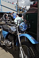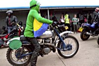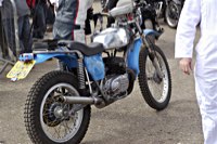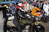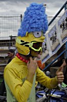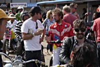 Of which there was a lot. Across all brands and makes, styles and flavours. Vintage English bikes of course like BSA and Triumph, but also home brewed Vespas, chopped mopeds, hide covered Japanese bikes, Bultacos, Ossas, racing bars, apehangers, shining customs, flat black and rotting 80s wrecks. The riders too were out in style or whatever you call it when a dude dresses up as a frog, complete with helmet. Or as Marge Simpson.