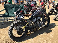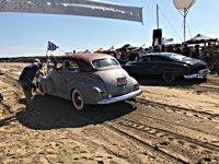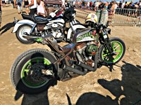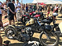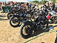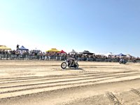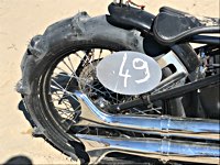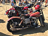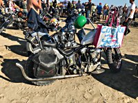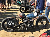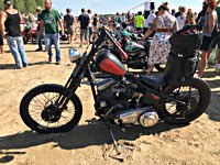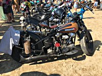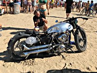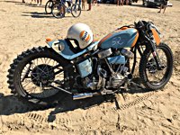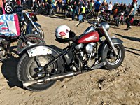 Starting time is a manageable 10:30. The idea is to a) make it to the finish line just 1/8th of a mile away and b) be faster than everybody else and your hangover. This elusive feat was miraculously accomplished (as last year) by Willi Miller by beating the other 49 motorsickles and their riders. We wonder what role Willi’s new 103 cu.in. Shovel engine played in all of this. Our Swiss friends of McSands were tearing up the sands quicker than most of the others too. Their tool of choice was again a Shovel, this one with 93 cu.in.. Coincidence?