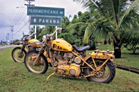 Next stop is Calexico/Mexicali. Tommy is riding the Panamericana proven, jungle mud encrusted and flat track hardened rigid PanAmericana Panhead, while Chris grabbed the PanAm Scrambster. Or Spormbler?