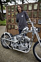 with Masayuki Sugihara, he comes across as calm, straightforward and clear, just like his work. And it quickly becomes clear how complex, meticulous and downright philosophical he is about the construction of each individual chopper. Whether it's the crazy story about the Shovel chopper for Flea, the bassist of the Red Hot Chili Peppers, or the detailed treatise on what he considers to be an almost unsolvable aesthetic problem, namely that there is way too much empty space between the engine and the upper frame tube on 70s-style long fork choppers.
