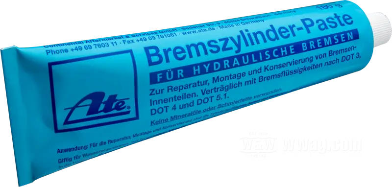 ATE brake cylinder paste is used for repair, assembly and conservation of hydraulic brake components. It is applied thinly and evenly to cylinder sleeves, pistons and seals. ATE brake cylinder paste is compatible with DOT 3, DOT 4 and DOT 5.1 brake fluids.