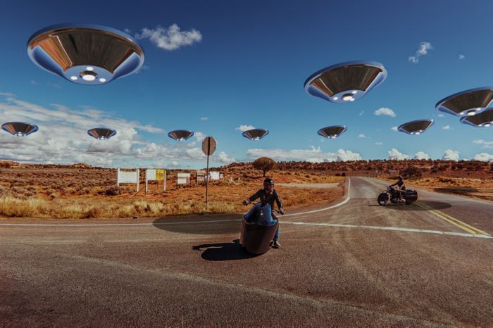DEATH RAYS! ANTIGRAVITY! ALIEN ABDUCTIONS! We’re proud at W&W to offer you the first ever V-Twin propelled flying saucer to avoid CLOSE ENCOUNTERS! We pulled this unknown shiny object from its orbit down to our own Area 42 and reaccelerated it again into outer space as a REAR VIEW MIRROR! ZAP! CRUNCH! SHRIEK! It comes in two WEIRD sizes, and two ALIEN surface coatings: black and chrome.