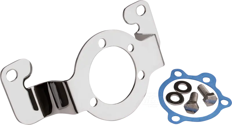 Chrome-plated carburetor support brackets for Big Twins 1984-up und Sportster 1986-up. Fit between carburetor and all flat air cleaner backing plates and mount to the stock mounting threads at the cylinder heads. Models equipped with the cylinder head breather system require an additional breather bolts.
