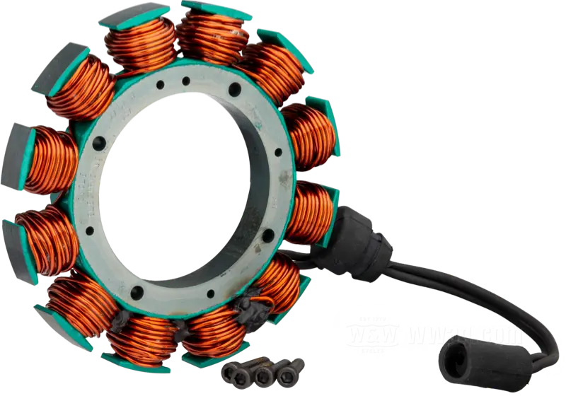 All Evolution and Twin Cam stators are located in a hot environment, saturated with primary lube. The insulation of Cycle Electric stator coils is able to withstand temperatures of 600° F to eliminate stator burn out. Better low speed output reduce battery discharge at idle. The lower operating temperature enhances service life. Improved plug rubber components will not swell or separate from the connectors.
