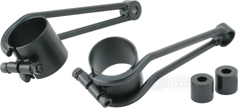 Universal use side mount headlight brackets which sport excellent craftsmanship. Sturdy construction with large, 40 mm long fork tube clamps. Length is measured from centre of fork clamp tube to centre of headlight mounting Bolt