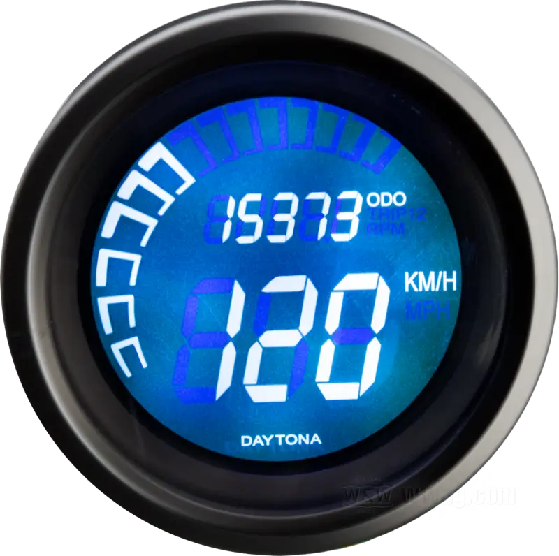 Twin function (speed and rpm), fully digital instrument which sports a round stainless steel, water-resistent housing. It features as Ø 56mm white backlit LCD screen with large 16 mm high digital speed indication and a combined bar scale/digital rpm indication. Speed is selectable between 0-399 km/h and 0-250 mph. The rpm scale is adjustable up to 20000 rpm. Further functions are odometer and two tripmeters, selectable between the digital rpm indication by two buttons on the back.