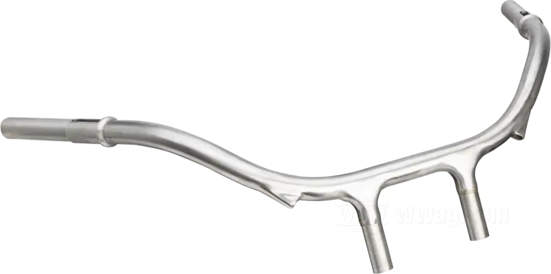 Despite their differences in shape, pullback, wire and cable exits and so forth, all these handlebars have omne thing in common that sets them apart from later handlebar models. They have two pieces of tubing brazed to the center section which are inserted into the fork tubes and then clamped by the upper fork brace. From 1915-1939 (last W solo models with the early cushion forks) the center distance of these two pieces of tubing was 4-3/4” (short of 121 mm for our metric friends). The way the handlebars were fixed in the fork tube top ends did not allow for any adjustments. To change a rider's position, the complete handlebar had to be exchanged, plus — of course — grips spirals and cables and wires had to be dismantled. Quite a bit of a job. But on the other side, the rider who was keen on a change had due to Harley-Davidson's ample model range a wide selection of different widths, pull-backs, heights and so on to choose from.