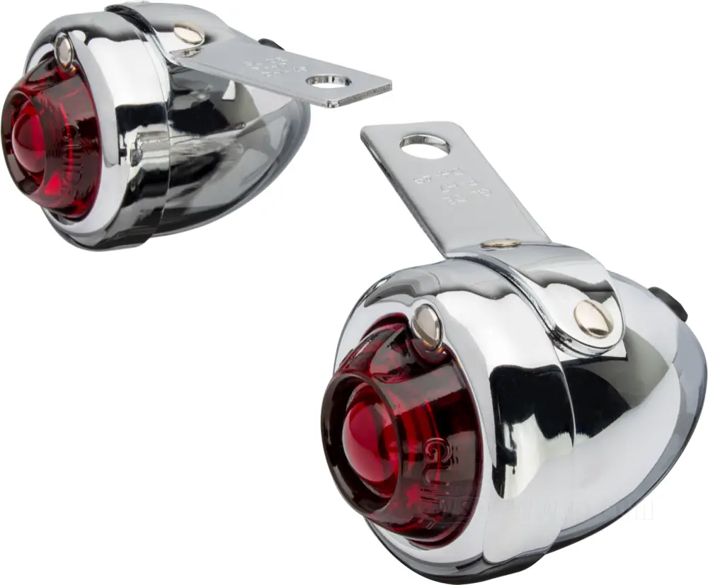Very nice reproduction of the Guide directional lamps with red "fish-eye" lens made of glass, as they were offered by Harley-Davidson as an accessory from 1950 onwards. The lens is marked "GUIDE" and "DH-49". Originally these turn signals were mounted under the seat on the T-bar (Seat) from where they indicated the change of direction to the rear. Both turn signals are marked "GUIDE", "PH7", "DH-49" on the bracket and the glass lens is marked "GUIDE", "DH-49".