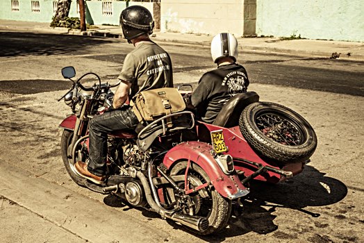 We manage to view the procedure as a kick start into the Cuban way of life and kill time by populating the rear seat and sidehack of Sergio‘s and Ernesto‘s Flat- and Panheads. The annual Concentración de Harlistas Cubanos in the seaside town of Varadero won‘t wait. We expect a first glimpse of Cuba‘s Harleydom and can maybe snap some photographs for later use in our catalog. We‘re not to be disappointed.