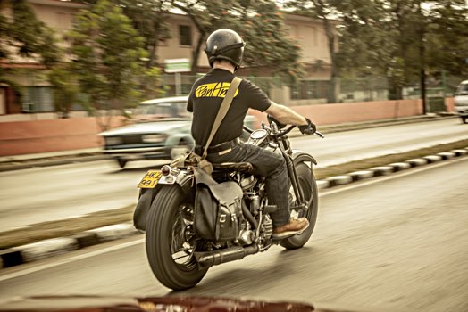 Freeways in Cuba have their own charms. Few cars, many potholes. Room enough for our bikes and Ernesto‘s panhead.