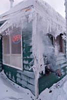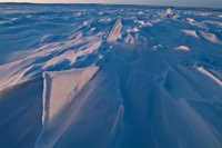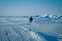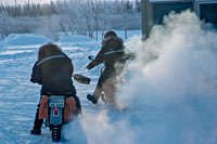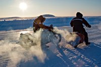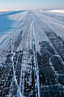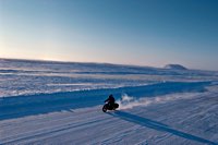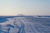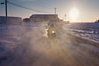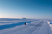 The bikes are running, the road is open. The studded wheels bite their way across Tuktoyaktuk. The streets are neatly covered with snow - like all the rest of this place. We meet the Tuktoyaktuk mayor for a quick shake hands. Nice riding conditions today. We pass the cemetery, heading out of town. Out to the Beaufort-Sea, to the ice road. The sweeping road swings through the white with grand air. Never really straight, here and there snaking around some twisted heaps of ice shards. Looks like someone was having fun building this road. So, how's the driving on the ice? Let’s ask the guys who did it: