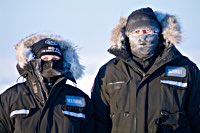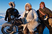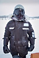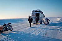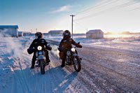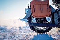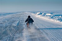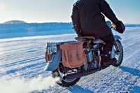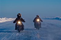 Apart from some fashion details it was the onion-style that was the choice of the thinking traveller. Multi layers of breathable cotton and quality wool, all with long sleeves. On top of all that went the Canada Goose Resolute Parka. Woolen socks to stick them in arctic-proof boots. The head protected by a balaclava, and a woolen hat, parka-hood optional. What about the hands? Snowboard-gloves scored best on our field test: reassuring thick quality that still leaves some sensitivity to the fingertips. This is enough for those who don’t ride. But what is the world class biker wearing for the ride on the Polar Sea? At speeds up to 60 kph the wind shouldn’t be underrated. We had prototypes of Aerostich overalls, result of a longtime personal relationsship between Aerostich and W&W. Another layer in our onion clothing concept. But there’s one trouble spot we didn’t have on our list: the hands. Sure, there are gloves. Gloves that promised to stand any weather. There are special wind deflectors fixed to the handlebars. Plus heated control grips. Doesn’t sound too bad. But it isn’t nearly enough. Which needed some miles of riding to find out. The first miles are pure pleasure. More: mind-blowing. The road, the ice, the landscape, the vastness, the endless white - blanking out little things like cold fingers.