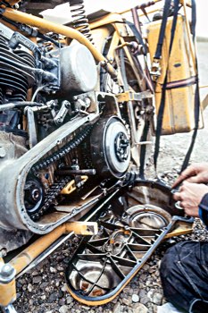 Leaving Bajo Caracoles, we plan to cover 230km today. But, just 50km down the Ruta, Tommy’s rear wheel locks up and the bike comes to rest in a large pool of oil. By divine intervention a pick-up truck driven by a couple of German climbers we had met the night before arrives a few minutes later, and they ferry the Panhead back to Baja Caracoles. There we find that the gearbox housing has broken from top to bottom, right through the mainshaft bore. It’s a serious – and expensive – setback. Using a satellite phone we arrange for a replacement gearbox to be couriered from Germany to El Calafate, 400km down the road. It’s the nearest place that anything can be couriered to, and we also have to hire a truck to get Tommy and the bike there, too. The only alternative is to abandon him and the Pan in the middle of nowhere. It doesn’t cross our minds. Honest.