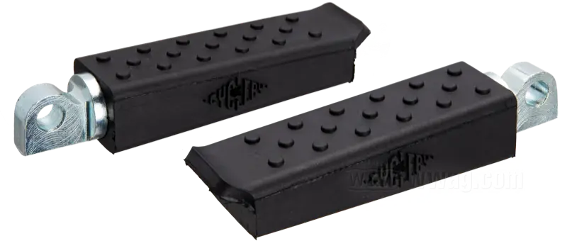 The design of these custom footpegs derives from vintage Tandem footpegs. With a set of these you can bolt both period look and modern functionality to you bobber or chopper. The steel core provides ruggedness and the knobby rubber encasement makes for a non-slip stand surface. Can be used as rider or passenger pegs.