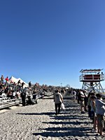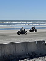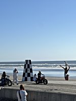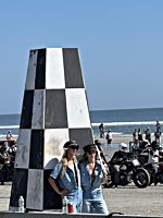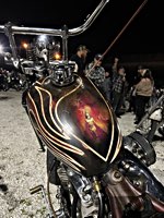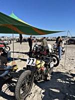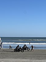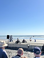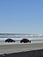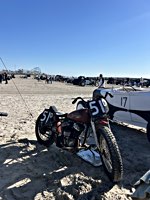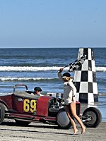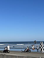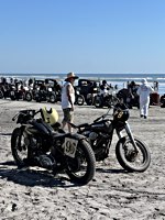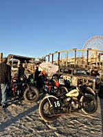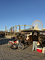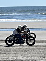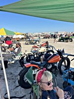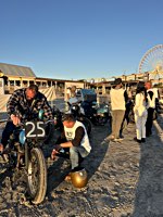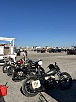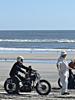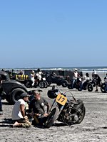 Is it last night’s beer, or are the first V8's being test run already? The by now well crowded area around the hotel has evolved into a boiling mixture of swap meet, impromptu pit area and last minute emergency repair zone. Between all the hot rods and race bikes, already wearing their race numbers, a wide sea of period engine blocks, dashboards, rev counters, headlights and whatnot were for sale, and awestruck punters were ambling around this low tech metal zoo. Speaking about zoos: the rare species of TROGlodytes had gathered on Friday night for their pre race drinks ritual in the Lazy Bass Bar. In front of which even Panhead chopper and Ironhead Harleys were allowed to park, though much too modern for next day’s event on the beach.