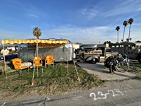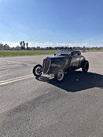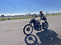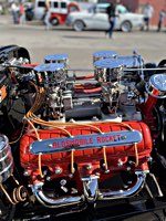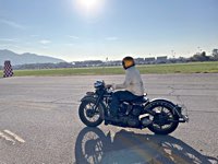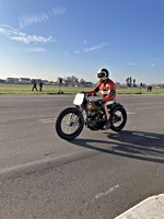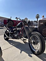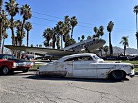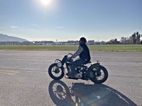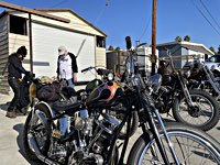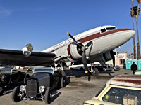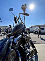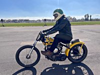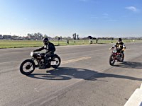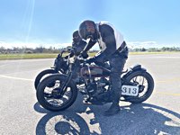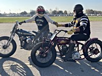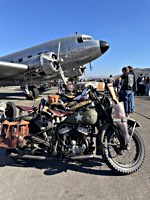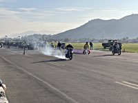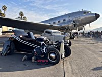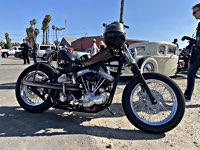 with spectators enjoying the vehicles, especially the classic planes on display in their natural habitat. Among flying machines and palm trees the vintage racers queued for the sprint races. Hell bent for leather they hot rodded down the course, beautiful flatheads among the Harleys, wicked Hotrods galore, and here and there among the crowd faces last seen at the Texas Born Free. Times was racing alongside the cars and bikes, and before you knew it the sun set in a palm tree fringed California sky on an afternoon to remember.
