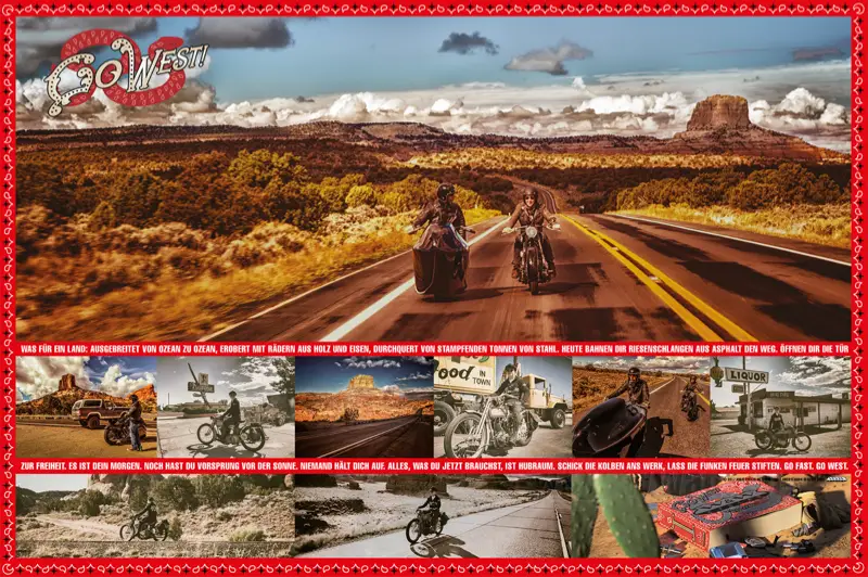 What a country. Spread out between two oceans, conquered on wheels of wood and steel, crossed by tons of steel-pumping iron. Today the snaking asphalt paves the way. Opening up the door to the freedom of the road. It’s your morning, sun’s still below the horizon, no one there to stop you. All you need now is cubic inches. Get them pistons to work, let them sparks light the fire. Go fast. Go west!