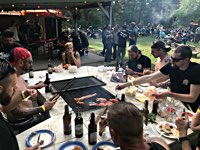 estaban aparcadas a buen recaudo y comenzaron con el cachondeo y el desmadre con una deslumbrante barbacoa, relucientes cervezas frías y grupos de viejos y nuevos amigos.