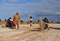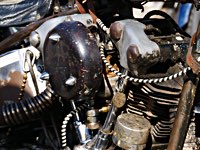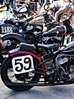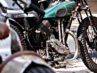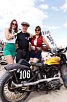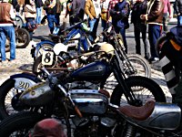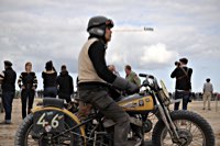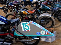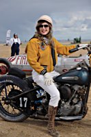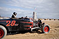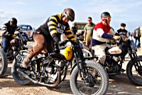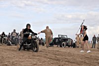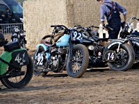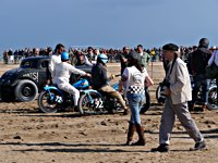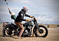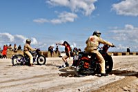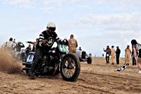 de la meteorología lo empezaron con lluvia, sólo para que quede claro quién manda. Pero luego se cansaron y volvió el sol con su glorioso resplandor sobre la arena. Los gladiadores aparecieron y encontramos un buen sitio cerca de la línea de salida. Genial, porque fue allí donde tuvo lugar el briefing de pilotos y al poco tiempo cayó la primera bandera. La Koslow Racer de Paul no estaba del todo en forma y hubo que trastear un poco en ella para devolverle el punto, pero finalmente Paul pudo alcanzar la línea de salida, motor en marcha, escapes rugiendo por sus cortos tubos. Hizo una buena salida, pero la arena removida por los coches se mostró difícil de manejar y bajo la superficie bastante seca hay una capa húmeda. Acelerar con la rueda girando libremente es duro para una moto. Paul no quedó contento con su papel y antes de la segunda salida tuvo que limpiar la arena de sus carburadores y transmisión secundaria. Entretanto, nuestro vecino y viejo amigo Speed McLean consiguió llevar su Knuckle hasta la red de seguridad y abandonó la carrera por un dolor de cuello.