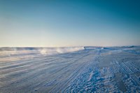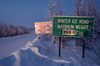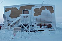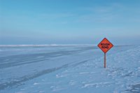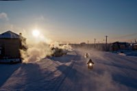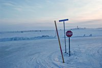 En el caso de que ésta se pueda denominar como tal. Aquí, en Tuktoyaktut, Northwest Territories, Canadá, donde hay una ruta solamente cuando las condiciones del tiempo son favorables, o sea, entre diciembre y abril; cuando hace tanto frío, que el Mackenzie River se congela. Entonces se puede labrar una ruta con el quitanieves hasta Tuktoyaktuk, a lo largo del río Mackenzie, saliendo por el delta hasta el Mar de Beaufort congelado. Sí, el mar, el mar salado y congelado. Puedes atravesarlo fácilmente. Tal como si hicieras el trayecto Miami-La Havana en moto. Tuktoyaktutk: 1000 habitantes, una estación de gasolina, un supermercado, un cementerio. Y un guardián de la RCMP, la Royal Canandian Mounted Police, donde nos registramos. Para avisarles que estamos aquí y tener su respaldo en el caso de que alguien se sienta molesto por el ruido de las motos. Ésta es otra razón por la cual Edward está a nuestro lado, Edward de Inuvik. Creció en la región, su hermana vive en Tuktoyaktuk y todo el mundo lo conoce.