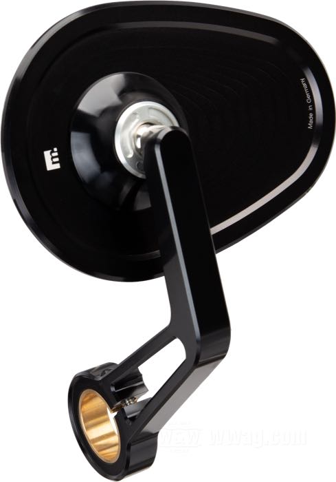 La característica especial de estos retrovisores para los extremos del manillar es la superficie de espejo patentada, que se corta directamente en el metal del cuerpo. El aluminio en sí mismo es la superficie del espejo! Esto permite un diseño ingrávido sin borde ni marco y el propio cuerpo se vuelve muy delgado y ligero. La rotura o la caída de vidrios simplemente ya no es posible. La superficie convexa de los espejos se produce mediante el corte con herramientas diamantadas en máquinas de ultraprecisión. Luego se hace resistente a la oxidación, la corrosión y los arañazos mediante un complejo recubrimiento de plasma en el vacío.