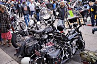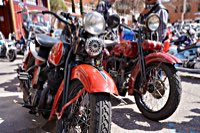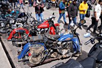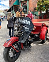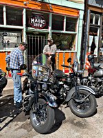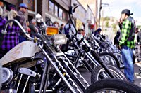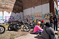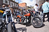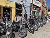 echando abajo la pata de cabra y aparcando sus Knuckleheads, Pans y Shovels, sus choppers, bobbers de granero, y las de calidad museo en el centro de la calle acordonada. ¡Que empiece la fiesta! Hay música en cada esquina, buenas vibraciones y gente estupenda.